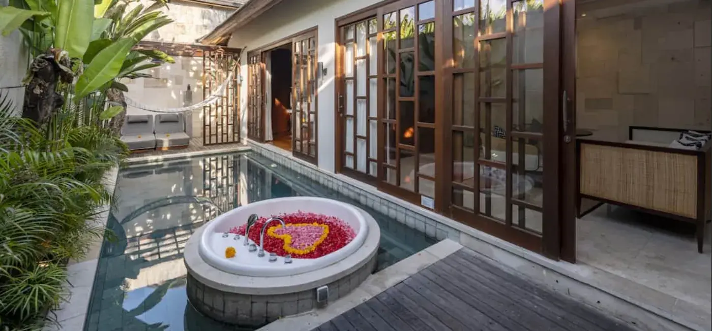 Asvara Villa Ubud is a luxurious boutique villa located in the heart of Ubud, Bali, Indonesia. It is situated just a short distance away from the bustling town center, yet it offers a tranquil and secluded retreat amidst lush greenery and rice fields.